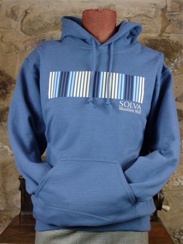 These hooded sweatshirts are printed locally for Solva Woollen Mill and features our own unique warping design. Wear it big and baggy for added comfort or opt for a smaller size for a closer fit. This quality hoodie in a lovely soft indigo colour is a staple of any wardrobe and looks great teamed with your favourite jeans for a laid back everyday look. The hood is double lined with matching drawstring. The hoodie also has a spacious pouch pocket.