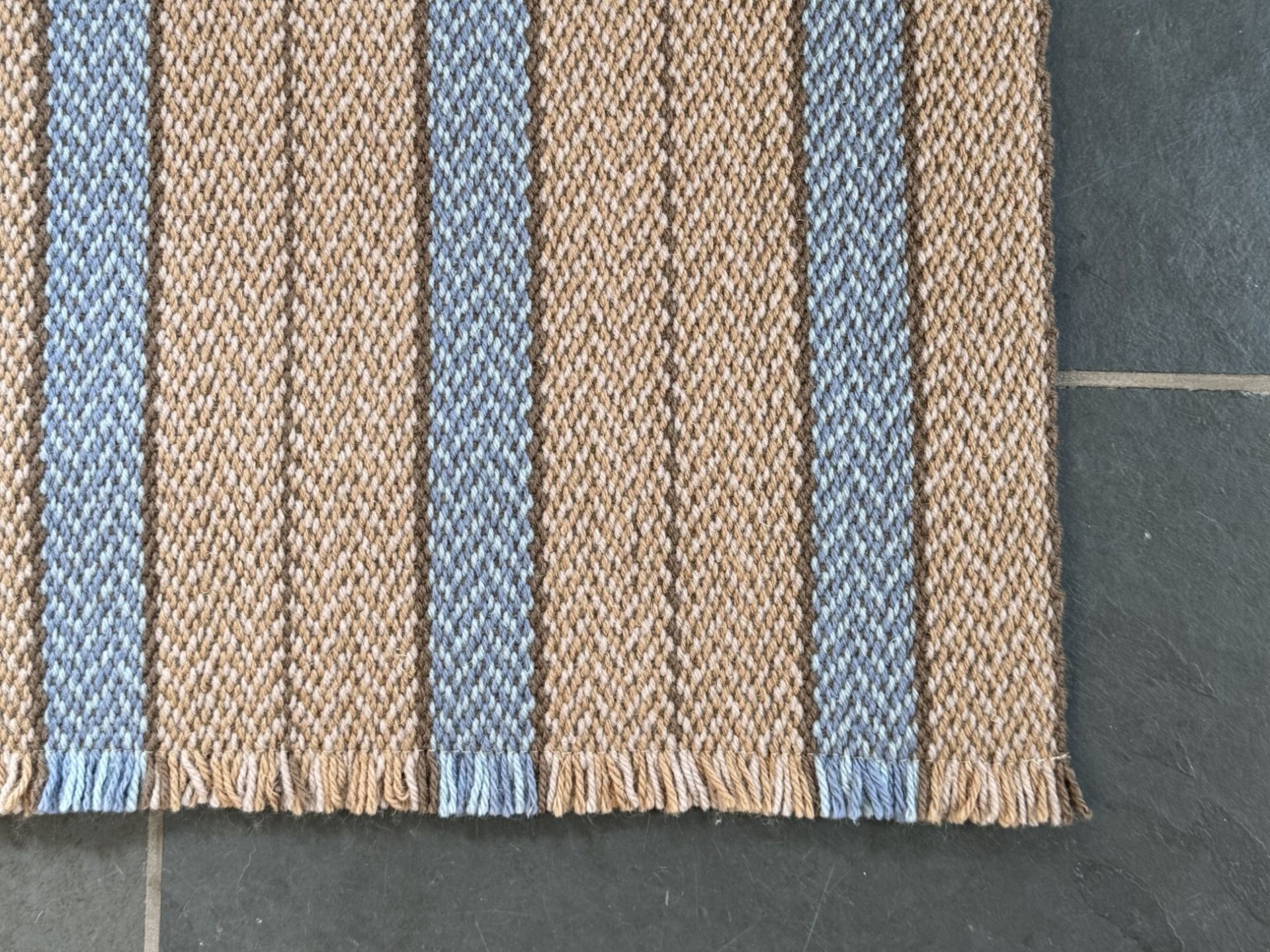 This runner is a different take on our classic Dyffryn design. Sandy, earthy tones lay as a background for soft blue stripes making this runner a lovely neutral for any space. Runner size approx. 69cm x 150cm.